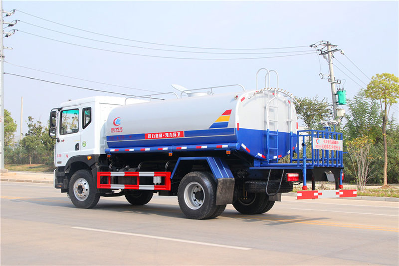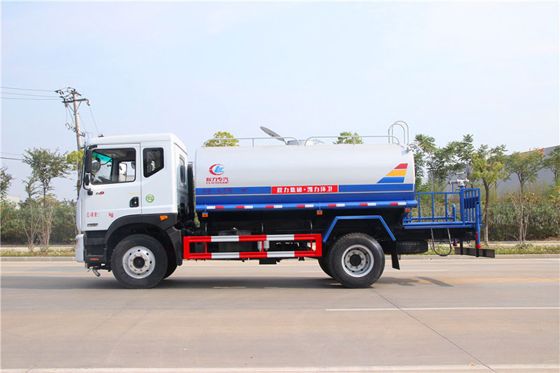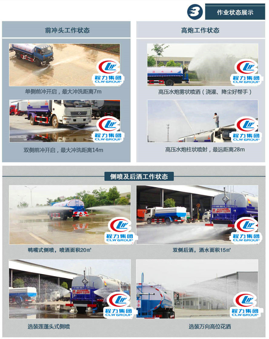 灑水車專用配置:罐體容積 13立方,罐體采用國標Q235碳鋼材質,罐體厚度4MM,前后封頭5MM加厚型,罐體內雙層隔板具有防波蕩作用,以減輕汽車行駛時罐內液體沖擊;灑水車整車及外形尺寸嚴格按照國家機動車公告制作而成;裝配大功率專用灑水泵,前沖、后灑、側噴、后平臺帶綠化灑水炮,灑水炮可全方位旋轉,可連續調成直沖狀、大雨、小雨、毛毛雨;配消防接口,自流閥,濾網,帶自吸自排功能。前封頭帶水位計,后平臺主管路帶1寸澆花接口,后爬梯,帶1個消防接頭,帶1個自流閥,1個過濾裝置,其余標配。1、可選裝后平臺帶霧炮機組用于噴霧降塵、農藥噴灑作業;2、可選裝前置電子灑水炮駕駛室操作;3、可選裝氣動球閥駕駛室操作。