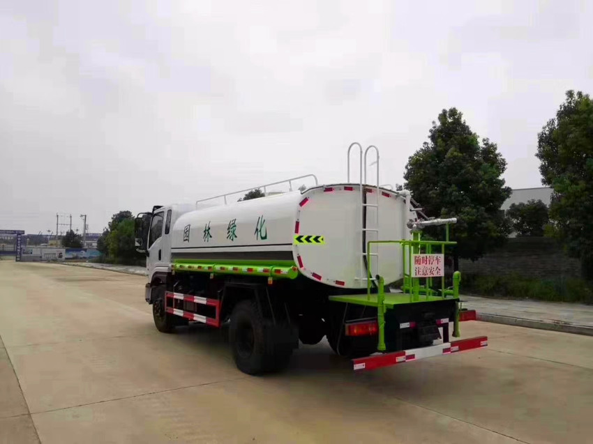 前沖、后灑、側噴、后工作平臺、360度可調節綠化水炮,水泵垂直吸程≧7米,前沖灑水寬度≧14米,綠化水炮射程≧35米,自流閥、濾網、消防接口(可連接消防栓取水,可作應急消防用)。罐前量管(觀察罐內水位)、罐后爬梯、罐上罐口帶簡易護欄、罐側雙炮筒、6米長4寸鋼絲塑膠管兩根,罐體表面雙層油漆工藝,防銹、耐腐蝕,其余有廠家標配?蛇x擇加裝加裝藥盤、氣動控制閥、噴藥設備、罐內防腐等。也可加裝液位計?膳渲萌β氏儡嚍⑺囁,應急時可作消防灑水車之用。我廠生產的灑水車均為多功能綠化噴灑車,可滿足不同用戶在不同的使用環境中使用,灑水泵可起到吸水和加壓排水功能,也可不通過泵自排水。