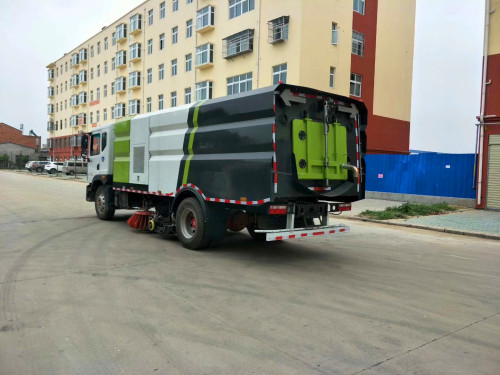 (1)洗掃車結合了掃路車和高壓清洗車的功能,高壓洗滌噴嘴布置在吸嘴內部噴水桿上,不但清洗效果好,還能最大限度減少高壓水氣流沖起污物產生的二次污染。