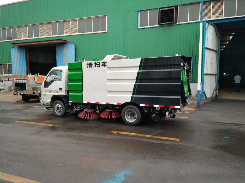 該掃路車采用福田型二類底盤改裝,加裝副發動機、風機、清水箱、垃圾箱、左右立掃、后置盤,掃盤降塵系統,液壓系統、專用裝置電控系統和副車架等改裝而成。