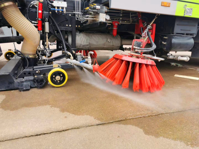 二、采用“中置兩立掃+中置寬吸嘴(內(nèi)置高壓水噴桿)+左右高壓側(cè)噴桿”的結(jié)構(gòu)。