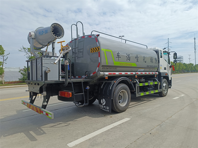 產品簡述:縱昂牌 CLT5188GPSEQ6A 型綠化噴灑車標配前噴(鴨嘴)、后對沖、 后灑、側噴、后置式工作平臺,平臺上配置綠化水炮(可 360°旋轉,既可以調 成柱狀,也可以調成霧狀),配備優質大功率專用灑水泵(可自吸自排,可從河 里或池塘抽水到罐體),取力器,雜物過濾網,消防接口,自流球閥系統、取力 器、球閥、濾網均為國家標準產品,主管道加粗,法蘭墊、法蘭盤加厚,大通徑 球閥。整體具備性能優良安全可靠、效率高、流量大、維修方便等特點