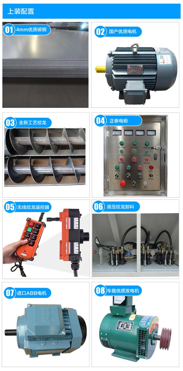 飼料車卸料裝置:外接380 V 電源, 外接電源成本低,環(huán)保,車輛損耗小, 卸料每分鐘500-700 Kg ,4 個5.5級進(jìn)口西門子電機(jī),