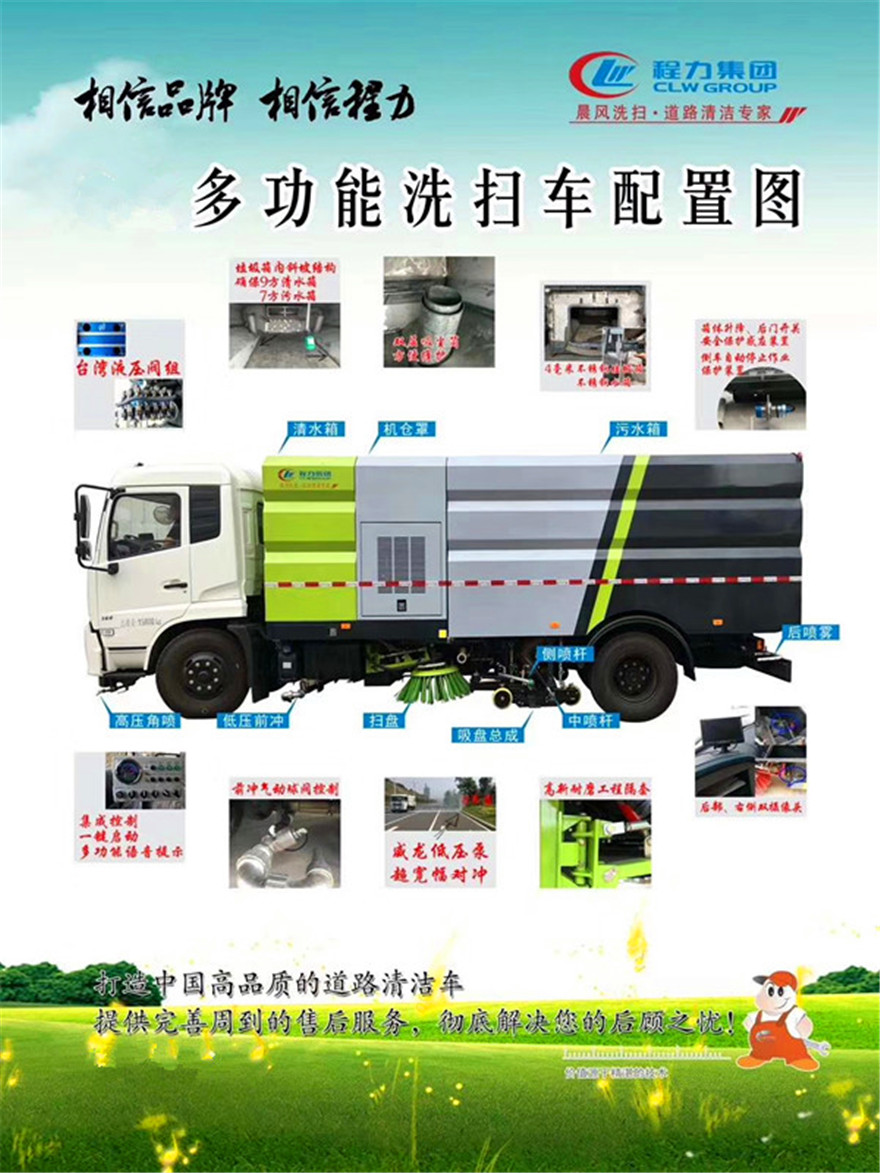 東風(fēng)8方洗掃車采用東風(fēng)型國五二類底盤改裝,加裝副發(fā)動機(jī)、風(fēng)機(jī)、高壓水泵、清水箱、垃圾箱、左右立掃、帶噴水桿的寬吸嘴、低壓沖洗系統(tǒng)、垃圾箱自潔,掃盤降塵系統(tǒng),液壓系統(tǒng)、專用裝置電控系統(tǒng)和副車架等改裝而成: