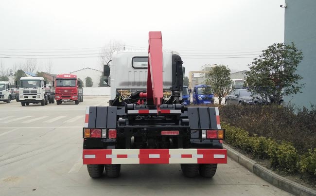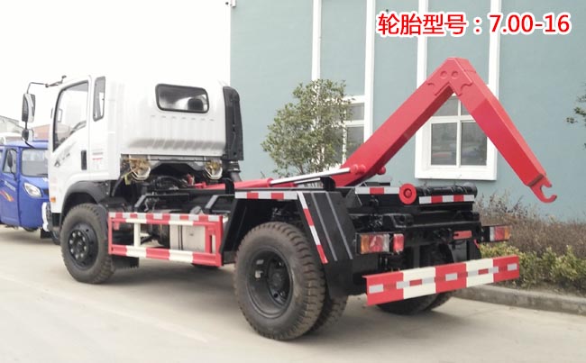 配套5~6立方米勾臂垃圾箱,高強度主勾臂,雙液壓油缸,采用國產油泵、多路閥、油缸,駕駛室外操作,尾部帶滾輪,箱體鎖緊裝置,鎖緊后可實現垃圾車自卸。