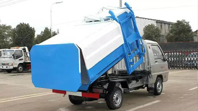 箱體容積2~3立方米,全密封式垃圾箱體,采用碳鋼邊三底四焊接制作,邊板折彎強化,箱體右側配液壓掛桶提升機,國產油泵、多路閥、取力器、油缸,卸料方式為底部雙杠液壓舉升自卸,駕駛室外操作,鐵桶掛架,后門機械鎖緊,手動開門,可選液壓開門。