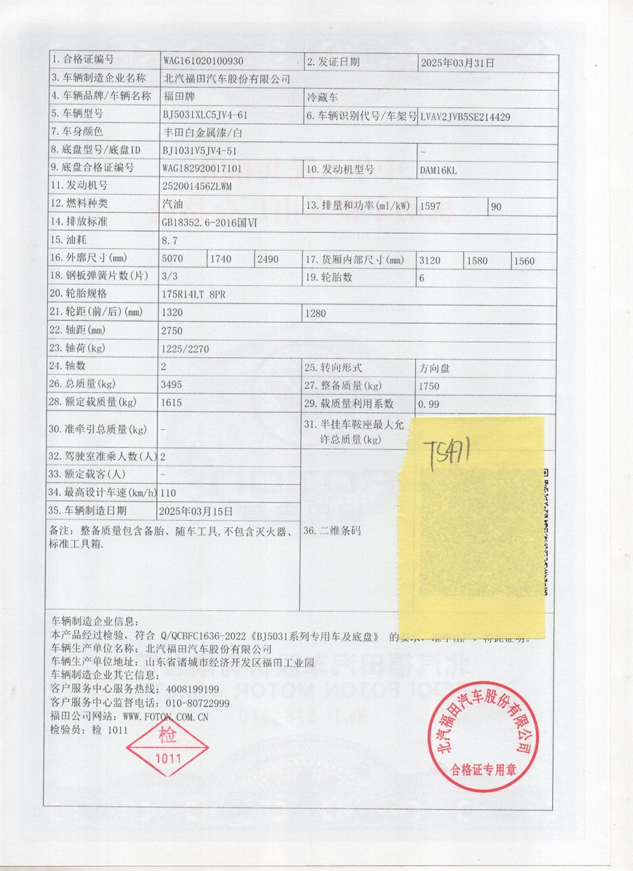 廂體采用內外玻璃鋼板材制作,中間填充8cm 厚高密度保溫材料,底板選用加厚型防滑花紋鋁板,鋁合金型材包邊,不銹鋼門鎖件,后雙開門,帶單側開門,匹配零下15度制冷機組。其余按冷藏車標配制作。提供機動車上戶手續(機動車合格證、上戶發票、車輛保修手冊、隨車工具)。