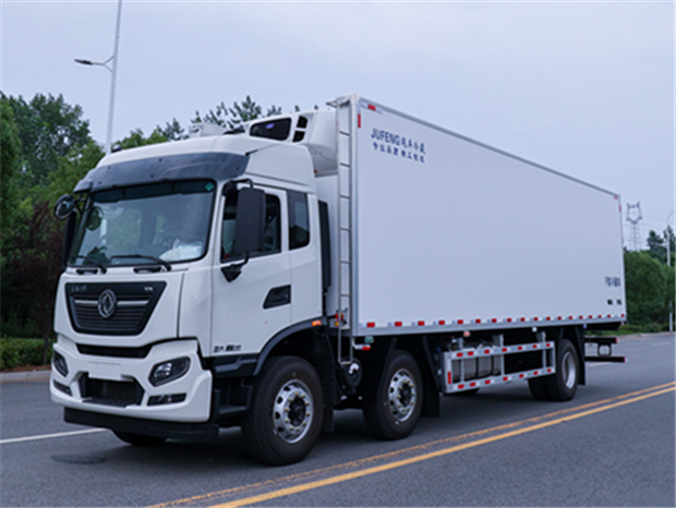 東風天錦8米6冷藏車基本參數:整車外形尺寸:9150,9900,10800,12000×2600×3990mm,車廂凈空尺寸可選為:6800,7680,8580,9680×2440×2450mm,車廂容積約為40,46,51,57立方,總質量為:25000Kg,整備質量為:10440Kg,額定質量為:14805Kg.國六東風柴油發動機,7.5L排量,300馬力發動機,陜齒9檔變速箱,整車型號為:DFH5240XLCE。