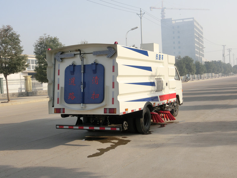 該掃路車采江鈴國五二類底盤改裝,加裝副發(fā)動機、風機、清水箱、垃圾箱、左右立掃、后置吸盤,掃盤降塵系統(tǒng),液壓系統(tǒng)、專用裝置電控系統(tǒng)和副車架等改裝而成(可加裝前沖后灑)