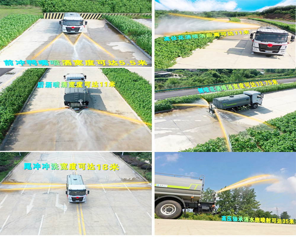 專用功能配置:罐體實際容積約為16立方米,公告有效參數15.8立方米、額定載質量9805KG/采用武鋼優質碳鋼板卷壓成型。配備專用灑水泵,自吸自排,前噴后灑、側噴、后工作平臺及灑水高壓炮。灑水泵自吸高度為6米左右,整車灑水寬度14米左右,后工作平臺水炮可調成:直沖狀、大雨、中雨、小雨、毛毛雨,有效射程≥28米,整車帶接頭、水位計,自流閥。后工作平臺主管路帶1寸澆花接口,附送2根3米水管,1個爬梯,兩側及后保險杠。 |